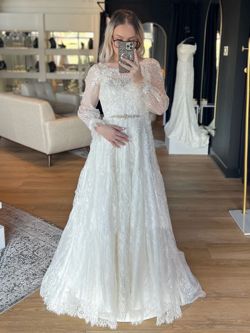 Eternal Grace is exactly what she sounds like! Offering a classic design, yet featuring modern touch ups like the sewn in crystal belt, and pearl adorned flower appliques. The soft lace falls gracefully along the body's curves and offers a lightweight option. This dress can also be customized.